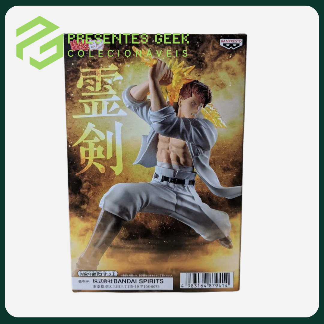Produzida pela Banpresto (Bandai Namco), a figura destaca-se pela pose de ataque dinâmica e imponente, com Kuwabara empunhando sua famosa Espada Espiritual (Rei Ken). O efeito translúcido em amarelo da espada simula perfeitamente a energia espiritual do personagem, criando um contraste visual incrível com a escultura detalhada de seu traje e expressão facial de determinação. É uma peça indispensável para colecionadores que buscam alta fidelidade e nostalgia para o seu acervo otaku.