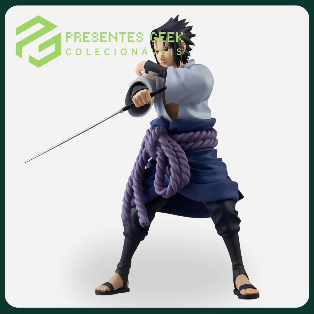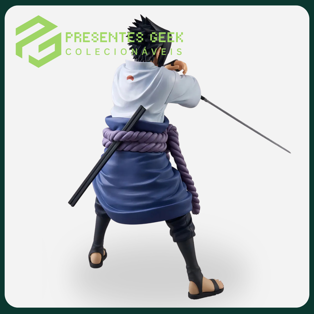 Com incríveis 27 cm de altura, esta estátua se destaca em qualquer prateleira, superando em tamanho e presença as linhas convencionais. A escultura captura Sasuke no início da fase Shippuden, com seu traje aberto, o cinto de corda roxa (Shimenawa) e empunhando a mortal Espada Kusanagi, pronto para cumprir sua vingança.